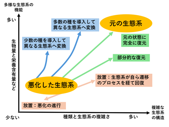 2025年4月施行された「地域における生物多様性の増進活動促進法」では、生物多様性の維持に加え、回復と創生に資する「増進活動実施計画」を認定する2つの制度が創設された。一つは、企業等が、「増進活動実施計画」を作成し、主管大臣が認定する制度と、2つ目は、市町村がまとめ役として、地域の多様な主催と連携して行う活動「連携増進活動計画」を主管大臣が認定する制度である。特に認定を受けた市町村は、土地所有者等と「生物多様性維持協定」を締結することで、長期的・安定的に活動を実施できると期待される。しかし、具体的な回復と創生の手法の議論はこれからである。悪化した生態系をどのように回復するかについては図2に示す多様な選択肢が考えられる。すなわち、1)元の生態系に完全に戻す、または部分的に戻す、2)元とは異なる生態系に置換する、3)自然のもつ回復力を活用し、人手はなるべく加えない等である。いずれの選択肢も現在の優れたサイトを維持するよりは、困難な挑戦となり、時間も要する。しかし、さらなるデータの集積、社会的学習、共創などを通じて、個人の変容と社会の変容、さらには、自然と地域の好循環の実現の好機と機会と捉えることもできる。