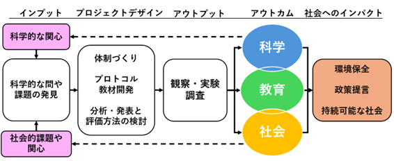 市民科学のプロジェクトは、一般的に図3に示すスキームに従って進められる。インプットでは、自然科学と社会科学の多様な分野が対象とされる。プロジェクトデザインでは、市民が容易な方法で精度の高い科学的なデータを収集でき、楽しみながら継続できることが重要な要件となっている。