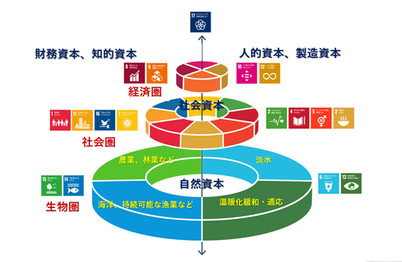 生物多様性は、社会、経済の基盤である。健全な生物多様性(生物圏)が維持されることで社会、経済活動が成り立っている(図1)。なお、自然資本は、生物多様性と同義であり、前述の世界経済フォーラムでは、世界のGDPの84兆ドルのうち44兆ドルは、自然資本に依存していると試算している(World Economic Forum 2020a)。