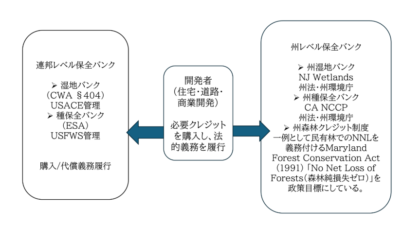 しかし、生物多様性クレジット制度は各国で多様なスタイルで発展しており、制度設計・市場形成・評価手法における蓄積がある[22]。米国ではすでにNNLに基づくミティゲーション(回避・低減(最小化)・代償(代替・補償:オフセット))制度が稼働しており、プラットフォームにおける市場取引がなされているので、以下に紹介したい。