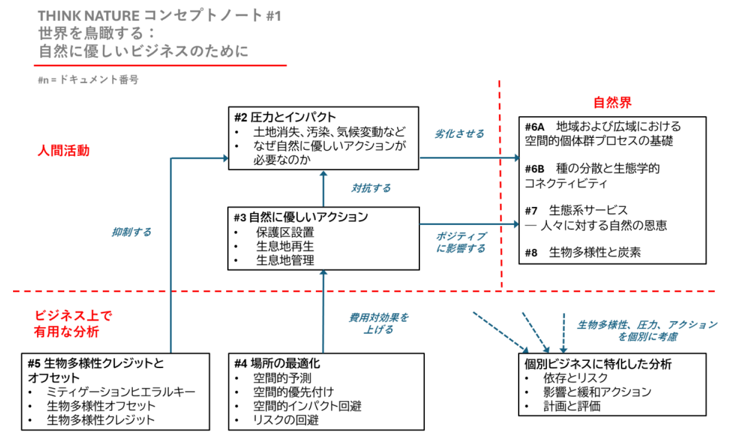 自然界と人間との相互作用の複雑さを踏まえると、このような分析ニーズを予測し、対応することは容易ではありません。この文書は、シンク・ネイチャーが人と自然の機能的関わりをどのようにとらえているのかを俯瞰したものです(図1)。より詳細に論じられるトピックは別文書に整理されており、それには以下が含まれます。(#2) 自然に対する圧力と脅威、(#3) 圧力に対抗するために用いられる自然に優しい行動の分類と特性、(#4) 空間的影響の回避および自然に優しい行動の配置に関する空間計画と地点最適化、(#5) ミティゲーション・ヒエラルキー、生物多様性オフセットおよび生物多様性クレジット、(#6A) 生態系および空間的個体群生物学の基礎、(#6B) 生態学的コネクティビティ、(#7) 生物多様性と生態系サービス、(#8) 生物多様性と炭素です。本シリーズには今後、他の補足資料が追加される可能性があります。本ドキュメントはシンク・ネイチャーのコンセプトノート・シリーズの第1弾であり、人間と生物多様性の相互作用を理解することに関心を持つ方々に対する公共サービスとして提供されます。