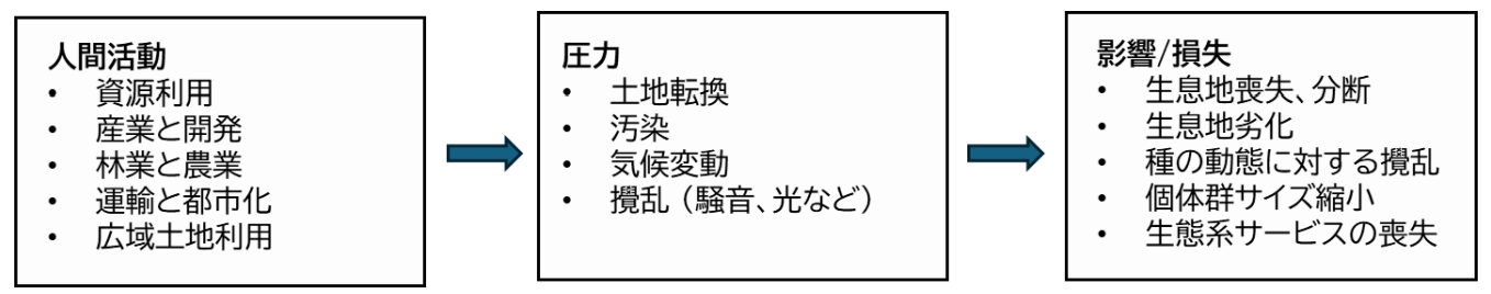 人為的な圧力anthropogenic pressuresとその自然への影響の拡大を背景として、自然界の現状を憂慮する世論が広まりつつある。さまざまな人間活動から生じる圧力は、脅威threats、ストレッサーstressors、ドライバーdrivers など、さまざまな言葉で表現される(図2)。影響には、生息地の直接的な損失と、騒音、汚染、気候変動などによる間接的な影響による生息地の劣化が含まれうる。圧力は、影響回避 impact avoidance によって減らすことができ、また、自然に配慮した行動nature-friendly actionsによってそれらに対抗できる(セクション2)。