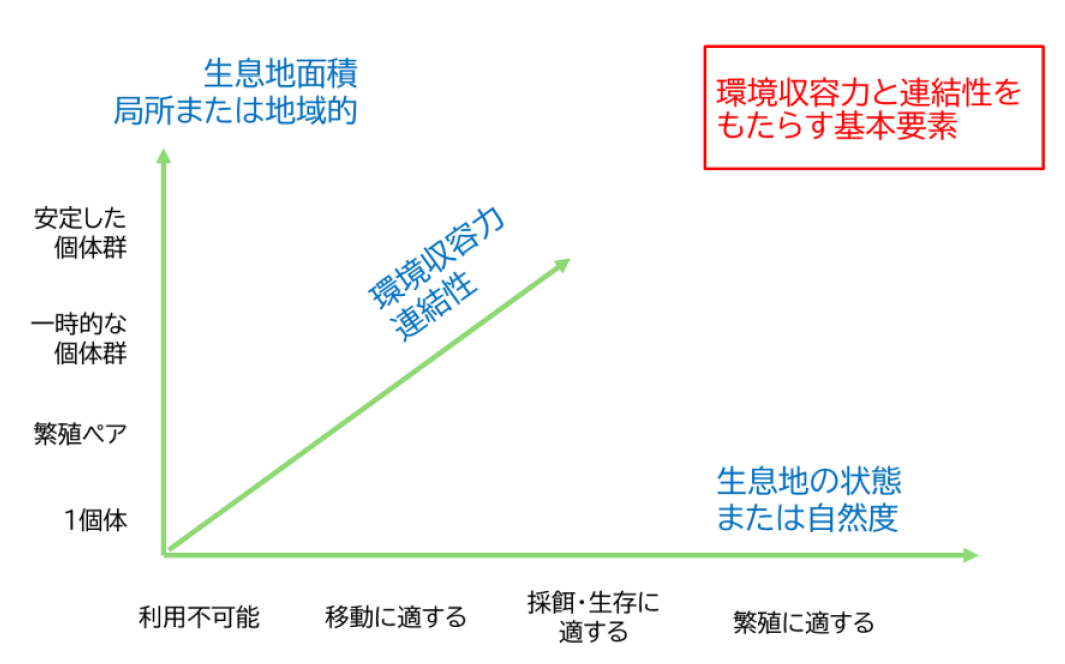 ハビタットタイプは、生物多様性を地図化する上でのもっとも単純な形である。図3は生息地の面積と生息地の生態学的状態ecological conditionが、種の環境収容力carrying capacityと連結性connectivity、ひいては個体数と絶滅リスクにどのように影響するかについての基本的な関係を示している。環境収容力とは、その地域が潜在的に支える(包容する)ことのできる個体数のことであり、連結性とは動物がランドスケープ内をどれだけ容易に移動できるかに関わる要素である。