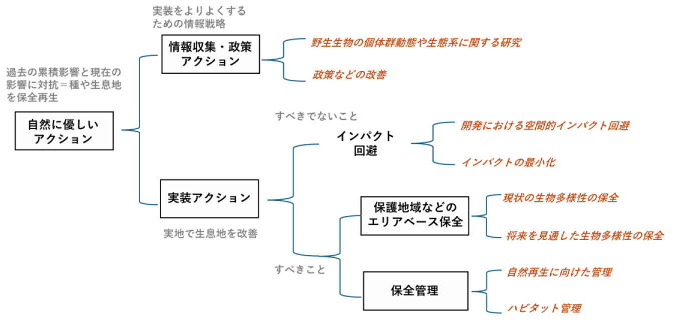 自然に優しいアクションの影響を理解するためには、そのアクションが生物多様性のどの要素に対してどのように貢献しているのかを評価することが必要である。その活動が情報収集(モニタリング)だけなのか、又は、現場アクションの結果なのか。また、対象活動が特定の種だけなのか、複数のグループなのか、又は広域の生息地タイプなのか、という問いによっても区分される。さらには、種の空間的個体群動態の構成要素がその活動によってどのような影響を受けるのかも評価することができる。図4は自然に優しいアクションの上位階層を示している。参照>このトピックに関しては、ドキュメント#3でより詳細に議論する。