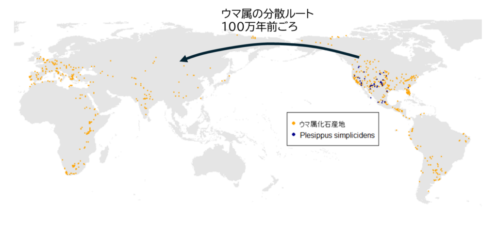 現在、野生のウマ(Equus属)種は7種が知られています(ノウマ、ノロバ、シマウマなど)。現生のウマ属の祖先としては、Plesippus simplicidens が知られています(かつては Equus simplicidens と記載されていたが、分類が改定)。この種は北米大陸で起源し、氷河期にベーリング海峡を渡り、ユーラシア大陸にたどり着いたと考えられています(Rook et al. 2019;図3) 。その後北米では1万年前ごろにウマは絶滅し、現在は在来分布するウマはいません。気候変動の影響や人間による狩猟といった複合要因が絶滅に影響したと考えられています。