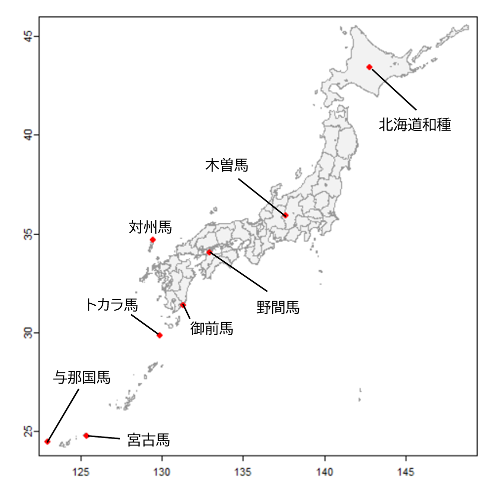 日本には、古くから放牧されてきた在来の馬種が存在します。競馬などで目にする西洋馬とくらべずんぐりした体躯が特徴です。こうした馬種としては、北海道和種、木曽馬、野間馬、御前馬、対州馬、トカラ馬、与那国馬、宮古馬の8つが知られています(図1)。ここで在来とは、在来自然分布を指すのではないことに注意が必要です。これまでは、南方と北方では異なる系統が日本にもたらされたと考えられていましたが、近年の研究で、すべてモンゴル地域から朝鮮半島を経て伝わったものであることが示されています (Tozaki et al. 2019) 。