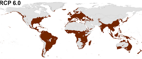 気候変動は本種の分布域拡大に貢献すると考えられていますが、実際にはその効果は限定的であることも予測されています。下図は、RCP6.0(2100年までに平均2.2℃の気温上昇)シナリオ下での2050年のヒトスジシマカの生息適性度予測です(同文献、図はCC-BYライセンス)。グローバルスケールで見れば、現在の気候下での適地と大幅な変化がないことが分かります。