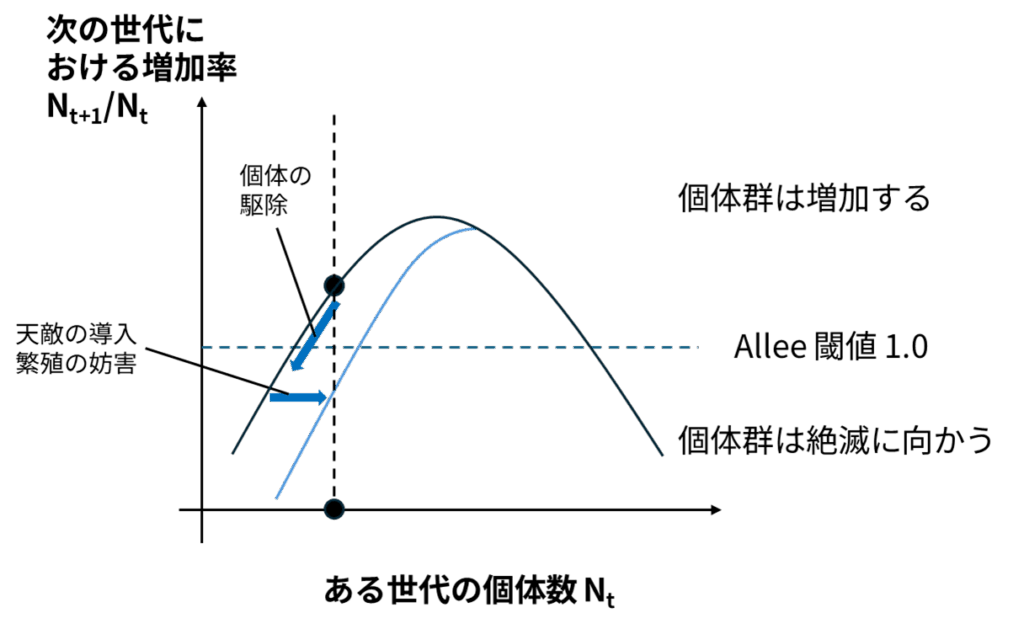 持ち込まれた外来種の個体群サイズ(個体数)とその定着率の間には、アリー効果という古典的に知られている関係があります。これは、そこにいる個体数が少なければ、それだけその個体群は維持されにくいという効果です (Tobin et al. 2011)。多くの外来種防除手法(個体の駆除、繁殖の妨害、捕食者の導入、コロニーの破壊)は、このコンセプトに基づいて整理できます(下図、Liebhold and Tobin 2008を参考に作成)。個体数を、個体群が生存できるAllee閾値以下に抑える介入(個体の駆除など)は、直ちに効果を発揮します。一方で、現状の個体数以上にAllee閾値を押し上げる介入(天敵の導入や繁殖の妨害)は、個体の生存・繁殖に不利な状態を維持することで、個体群を絶滅に向かわせることができます。