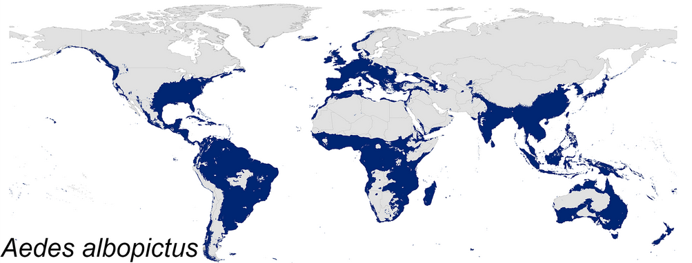 本来の生息地外に分布を拡大している蚊の代表例は、ヒトスジシマカ Aedes albopictus です。デング熱やジカ熱などさまざまな感染症を媒介し、世界の侵略的外来種ワースト100にも含まれるこの種は、1980年代以降世界中に分布を広げ、公衆衛生上の問題となっています (Bonizzoni et al. 2013)。