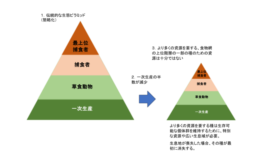 図2は、生態ピラミッドの文脈における土地の転換/生息地の喪失を示している。一次生産は植物によって提供され、植物は土壌からのミネラル、大気からの炭素、水、太陽のエネルギーをバイオマスに変換する。草食動物は植物を食べる。草食動物によって消費されるのは植物のごく一部であるものの、ピラミッドの形状は狭くなる。捕食者は草食動物や、場合によっては他の捕食者を捕食する。生態ピラミッド(食物網)の階層が上位になるにつれて、利用可能なエネルギーはますます少なくなる。その理由として、それぞれの下位の階層の維持のためにそれぞれのエネルギーの大元である太陽からのエネルギーの一部が使われるからである。個体群を維持するには生息面積が小さすぎる場合、もしくはその種が必要とする資源が特殊で、かつ広く薄く分散している可能性がある場合、地域的にかろうじて生き延びているに過ぎない種も一部存在すると考えられる。そのような専門種(specialist species)もしくは食物網の上位階層の種は、深刻な生息地喪失の後に最初に姿を消してしまうことが多い。